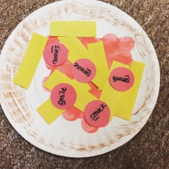 Our craft for the speech therapy sessions was fun and easy prep. Each child started with a small paper plate. The child colored the outside edge brown to resemble pizza crust. You can either have the child paint the “sauce” or cut a red blob of sauce from construction paper. By the end of the week, I preferred the construction paper blob. The red paint tended to not dry fast enough so the yellow paper would soak the red paint up. I cut up small strips of yellow paper to represent cheese. The red circles are pepperonis. For my artic clients, I wrote the target words on each pepperoni. Some of the kids liked bell peppers on their pizza so we used short pieces of green pipe cleaners. The bottom pizza was made by a child working on asking questions to get his materials.