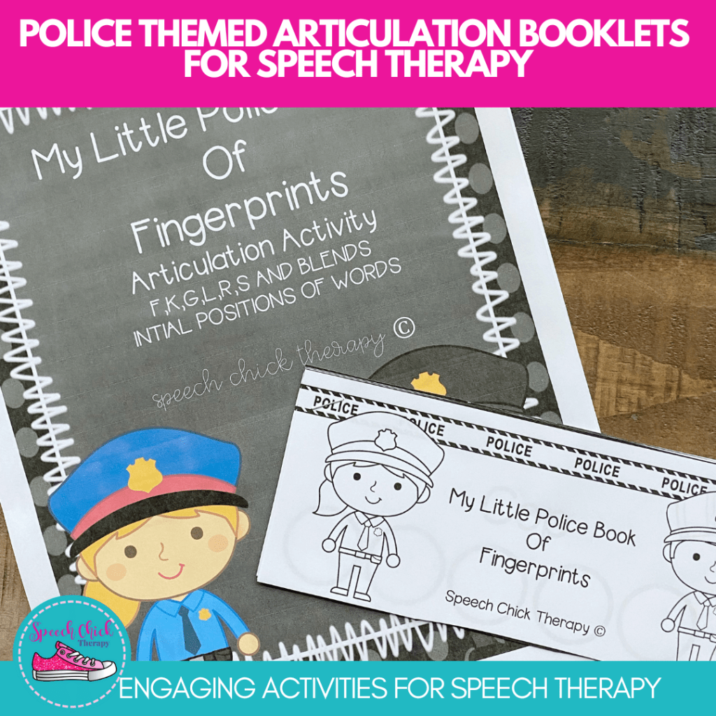 Our articulation activity was “Police Fingerprint Articulation Books.” I told the kiddos one job of a police officer is to collect fingerprints. The kids loved fingerprinting in these little booklets!!! Each fingerprint meant they had to say a word correctly 3-5 times. Then the booklets could be sent home for extra practice! (Instant home carryover activity ALERT!!)