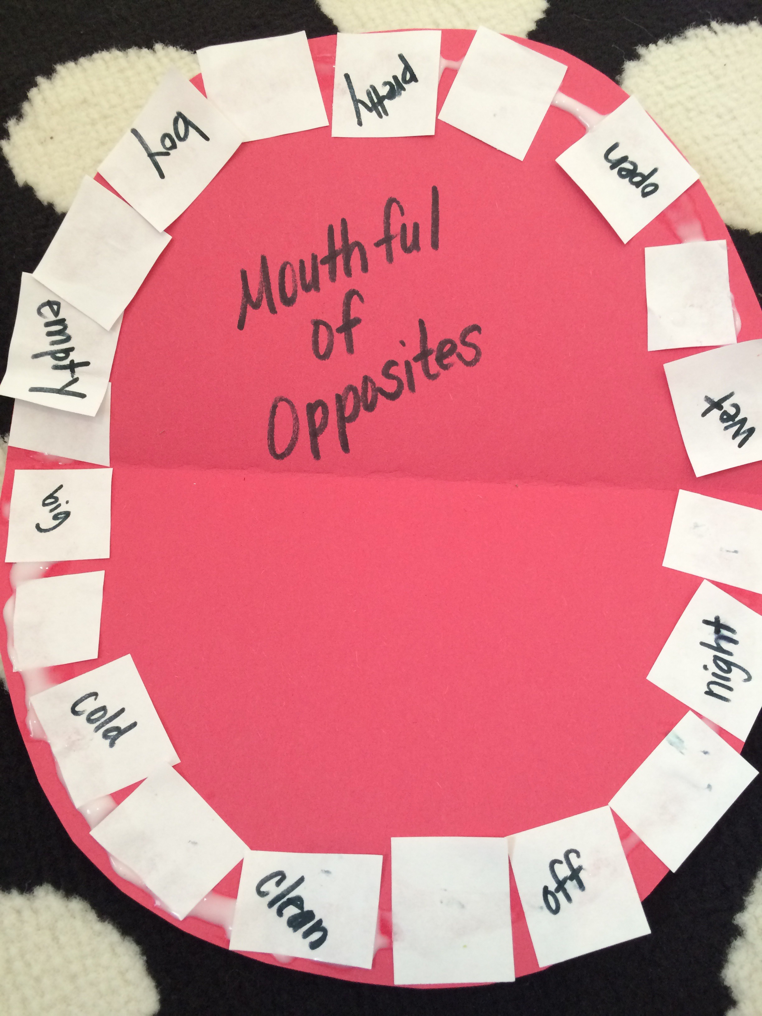 In the picture below, my client was working opposites. I wrote words on half of the teeth. In order to glue 2 teeth in the mouth, he had to give the opposite of the given word. You could easily do this with synonyms. If you choose to work on verb tenses or plurals, write the present tense (for verbs) or singular form (for nouns) on a tooth. The child must give the past tense (for verbs) or plural tense (for nouns).