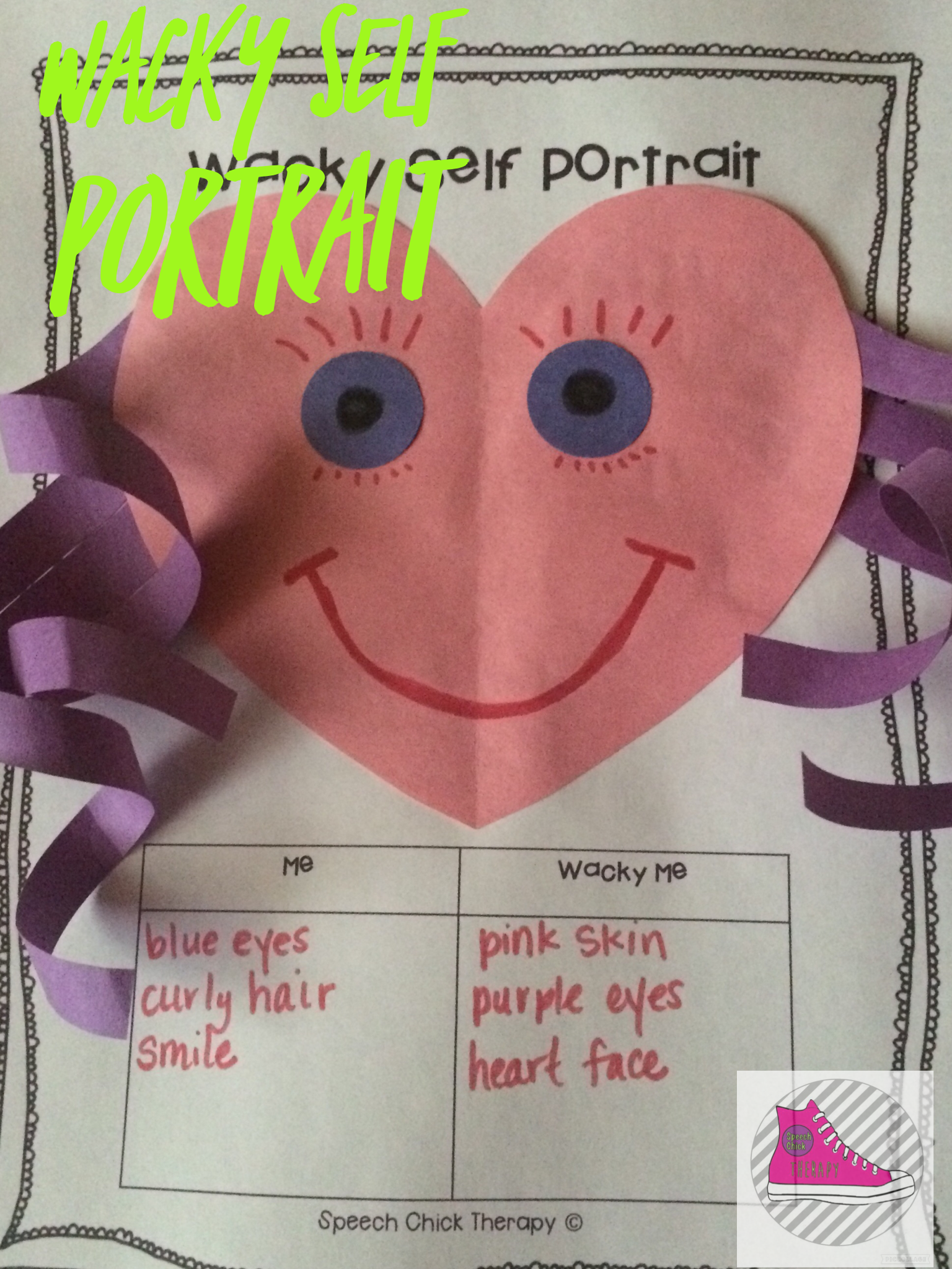 Another new book to add to the shelf. I used this book and activity for kindergarten age and up. We read the book and talked about the absurdities. We talked about how the absurdities could not possibly be true. Then we had fun with construction paper and other craft materials! I instructed my clients to make self-portraits but make them wacky. So if you have brown hair, use blue paper instead. If you have green eyes, make them green but a different shape. After all of the project was finished, we compared/contrasted our wacky selves to our regular selves. We made sure to write our answers at the bottom of the picture.