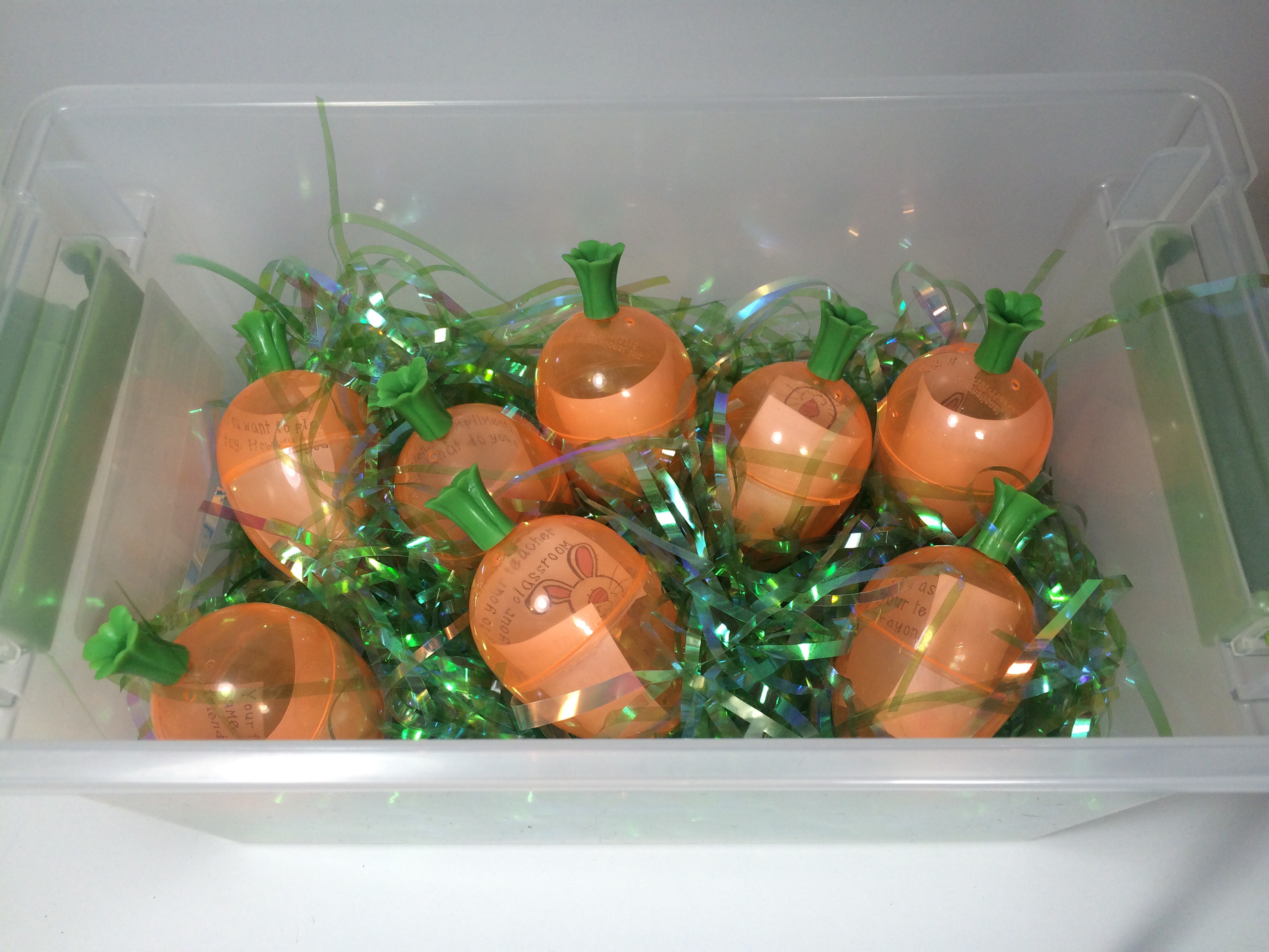 Sensory bins for Easter are so easy! Grab an Easter basket, some shredded paper or Easter grass and a package of Easter eggs. Add a little bunny or chick. I have a wind up bunny that I will be adding this year. I have several different Easter bins that ride along with me all week. It’s easier to have 3 different ones than to constantly change the eggs out each session. I also use different types of eggs so that I know which language skill in each egg.