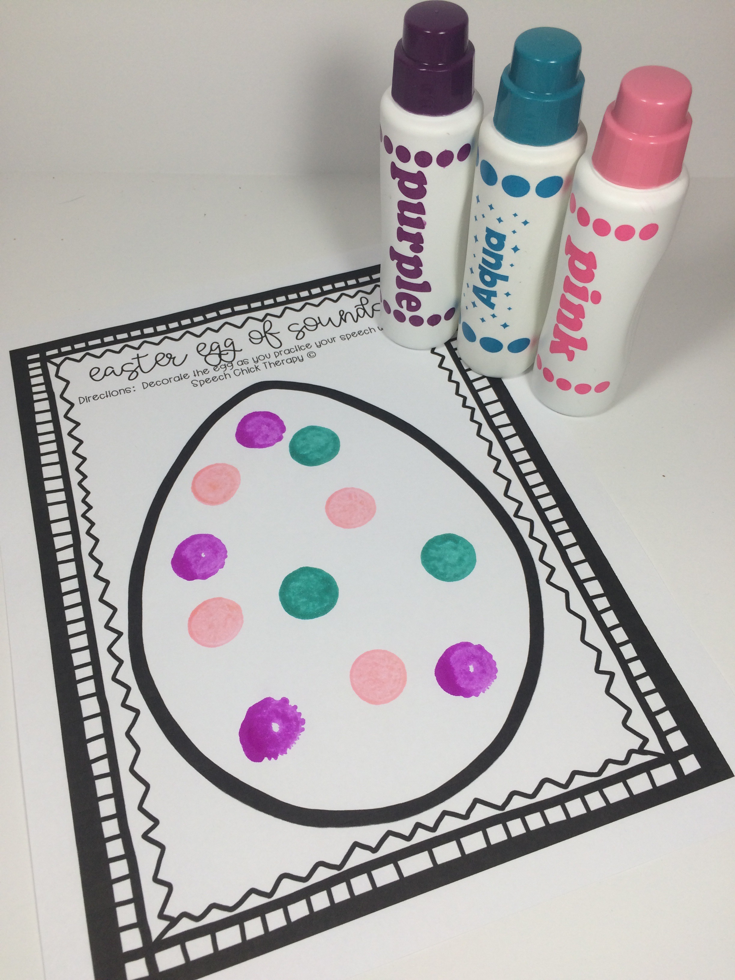 I try to keep my crafts as easy as I can. Working with kids that range from less than 2 years old to school age all in one day, I also have to make sure they can cover a wide variety of goals. Cue the Easter egg craft! To use for articulation, just have the child paint a dot for each word he says 5x correctly. To use for language skills, have the child perform a language task (give the opposite of a word; use irregular past tense verbs in sentences, etc) before painting a dot. Then cut out the egg and glue onto a piece of colorful paper. My little ones who are working on increasing MLU will have to tell what color they want in order to paint.