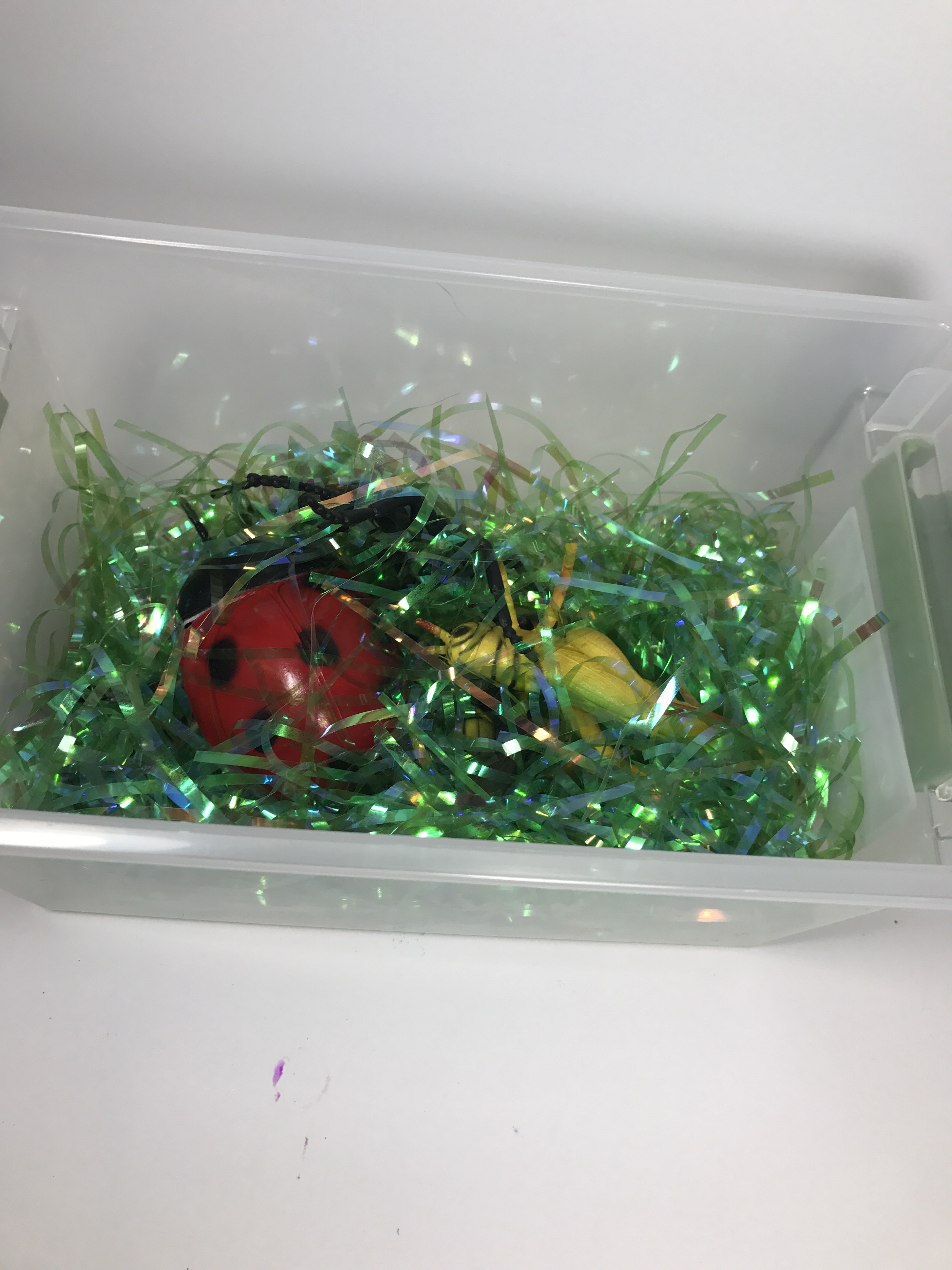 This sensory bin was super easy. Remember that Easter grass from last week’s bin? Just add plastic bugs! This set of bugs I bought several years ago from Toys R Us. It includes bugs in big, medium and small sizes. I love it because then I can use them all to work on simple descriptions such as “find the big ladybug.”