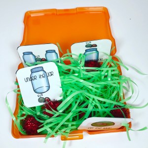 I made another mini sensory bin for my ladybug theme. Using leftover Easter grass (or you could use beans), add sparkly red pompoms for the “ladybugs.” The cards are from my “Speech and Language Ladybug Fun” packet. I put one set of matches in the bin. The other set is kept out so that the child can match the cards.