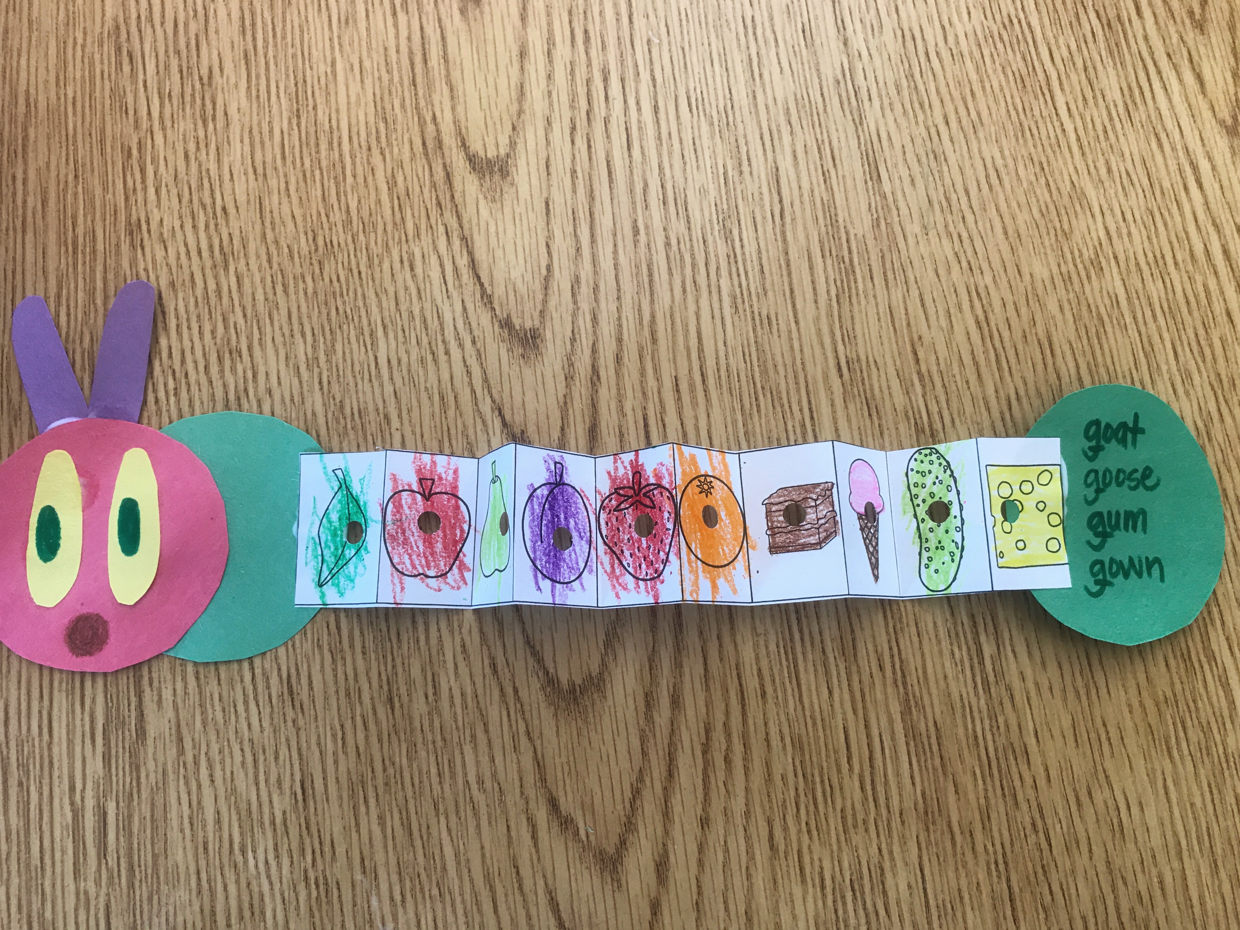 Cut out 2 green circles and 1 red circle. I cut out yellow ovals for eyes and purple antennas. A green marker was used to draw smaller ovals in the yellow ovals and a brown crayon was used for the mouth. (You could do it all from paper.) The child can color the food on the strip. Once all the foods are colored, have the child produce a target word correctly 5x. He can then, punch a hole in one of the foods. Repeat until all 10 foods have a hole punched in them. They should look like the foods in the book! Now assemble the caterpillar! Glue the red and green together (overlapping slightly). Glue the leaf end of the food strip on the green circle. Then glue the other green circle to the end of the food strip. Glue the facial features on the red circle and it’s done! I wrote the target words on the last green circle. You can grab the food strip in my FREE resource library! (You can sign up here!)