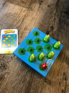 I have a game I love to use! It is great for problem solving. “Hoppers” is great for older kids. I use it with my elementary age clients as well as my fluency clients. Set the puzzle up and jump all the frogs until only the red frog remains. I like the critical thinking the kids have to do in order to solve the problem.