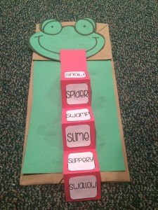 I have two crafts that I choose from during frog week. One of them is in my frog packet (you can find it here!) For this craft, all you need is a paper bag for each child, a frog face (in the packet), a strip of red construction paper and the target words (also in the packet). Color the frog face, cut out and glue on the flap of the paper bag. Cut out the target words. Fold the red strip accordion style. Glue the “tongue” (red strip) under the bag flap. As the child practices the words correctly, he can glue a target word on the tongue.