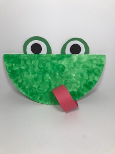 The second craft is just as easy! Paint a large paper plate green. Fold in half. Cut out 2 large circles from green paper. Cut 2 medium circles from white paper. On the white circles, color a black circle on each. Glue the green circles on the fold of the plate. Then glue the white circles on the green circles. Those are your frog’s eyes. Cut a long strip from red paper to make the tongue. Roll around a pencil so that it is curly. Glue the tongue in the fold of the plate. Done! You have a frog!