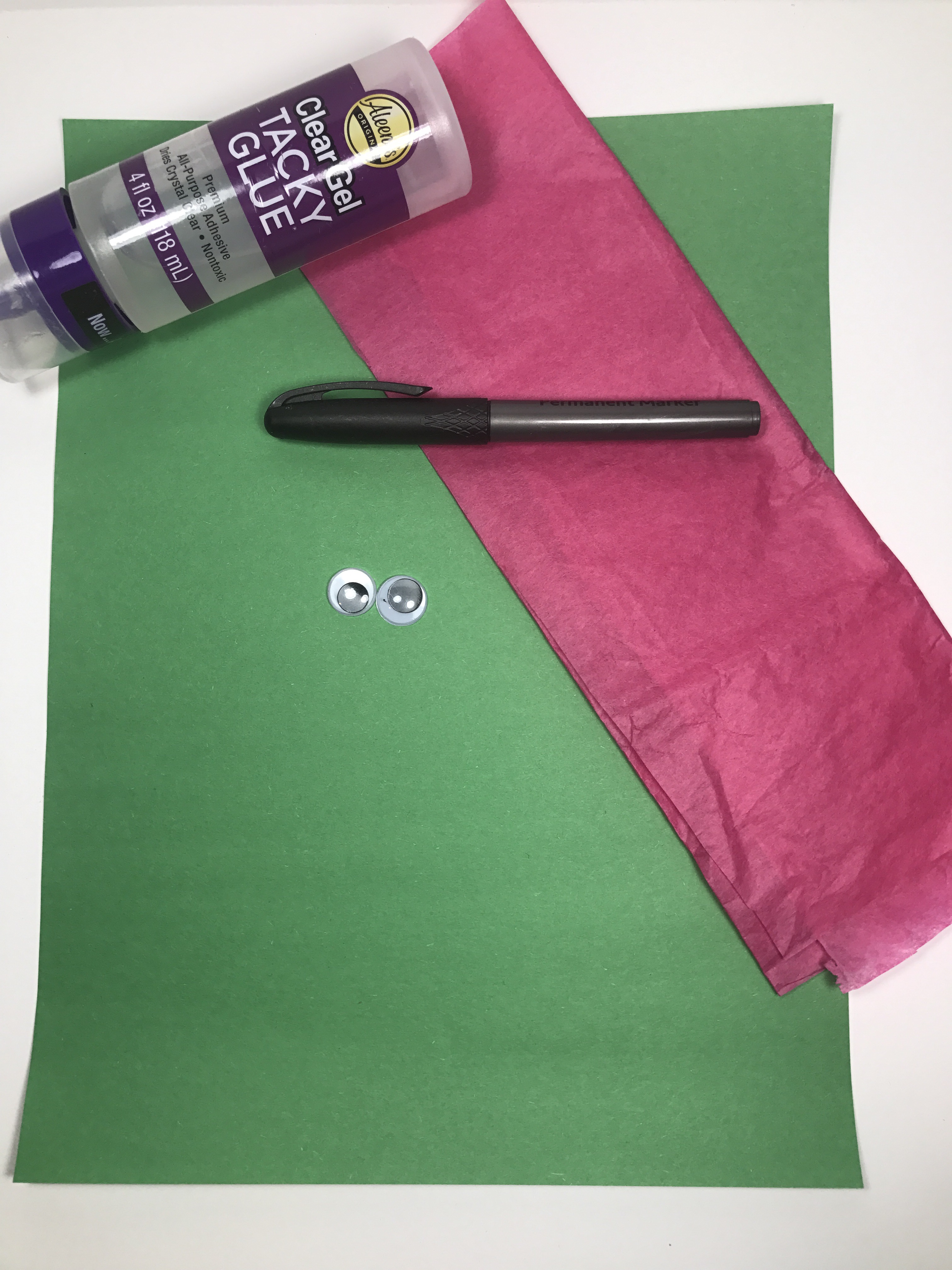 The wiggle eyes are completely optional. I almost did not put them on the cactus. But once I did, the birthday girl thought it was cute. Cut a cactus shape out of green construction paper. Make small squares from the pink tissue paper. Use as many as you would like!