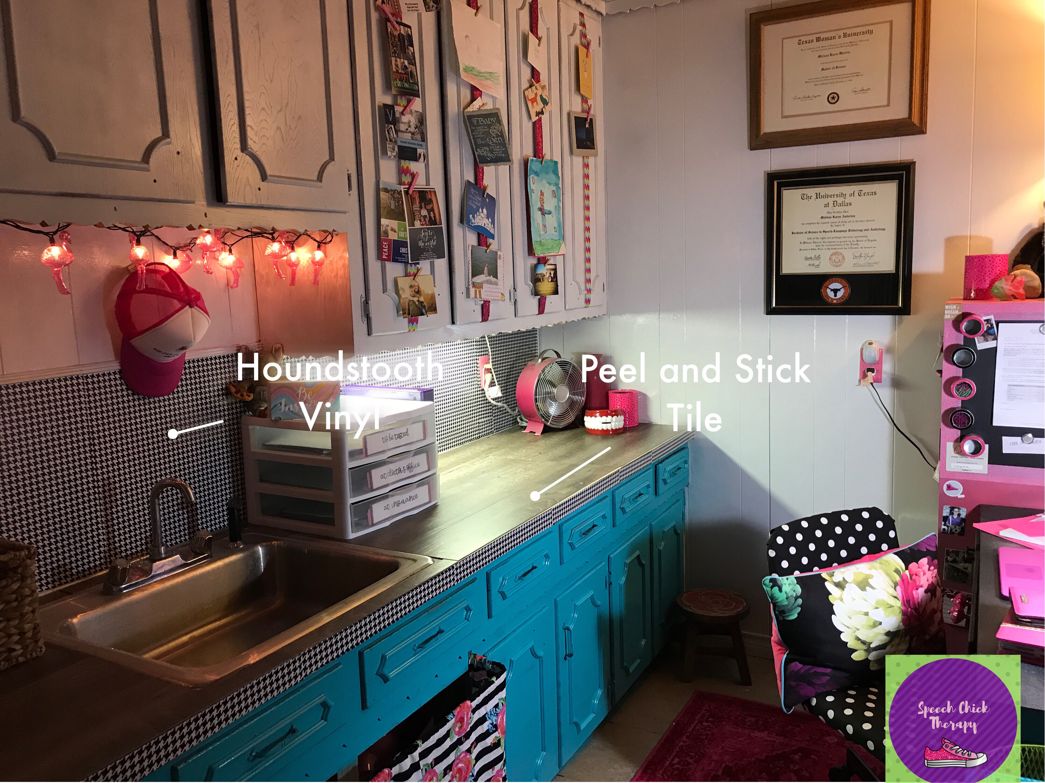 In my office, there’s one long counter that has this gorgeous faux marble vinyl (yes, there’s sarcasm there!). It is also the backsplash. It was really ugly now with the bright white walls. New counters were not in the budget so I covered them!! For the backsplash, I covered it in super cute black and white houndstooth vinyl (code: contact paper). The counters are covered in peel and stick tile that resembles wood flooring.