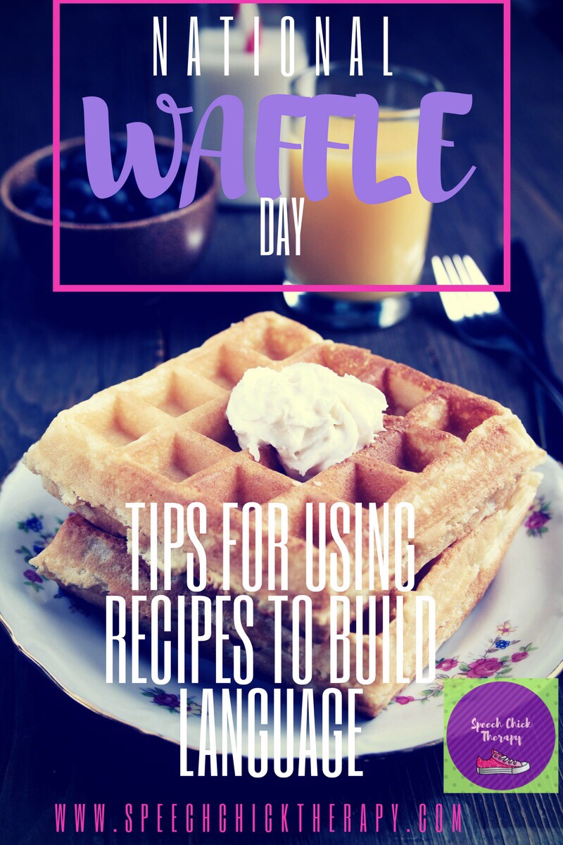 Did you know that today is National Waffle Day? I know…I’m not sure why the banks didn’t shut down either. While I am not a big breakfast eater, I sure do love a good waffle. So today in honor of this “major” holiday, I am bringing you some fun ideas to use with the kids! You know I think having kids in the kitchen is a great way to enrich language!!! What’s so great about cooking with this kids? Only EVERYTHING! As a parent, you can teach skills in a natural environment. At school, it’s all “fake.” Measuring is abstract as at school but at home it’s REAL! You are actually measuring flour and sugar. If you miss up, there’s real consequences like your waffles taste yucky! Sequencing, following directions, asking questions, requesting ingredients, vocabulary…oh my gosh, I could go on and on.
