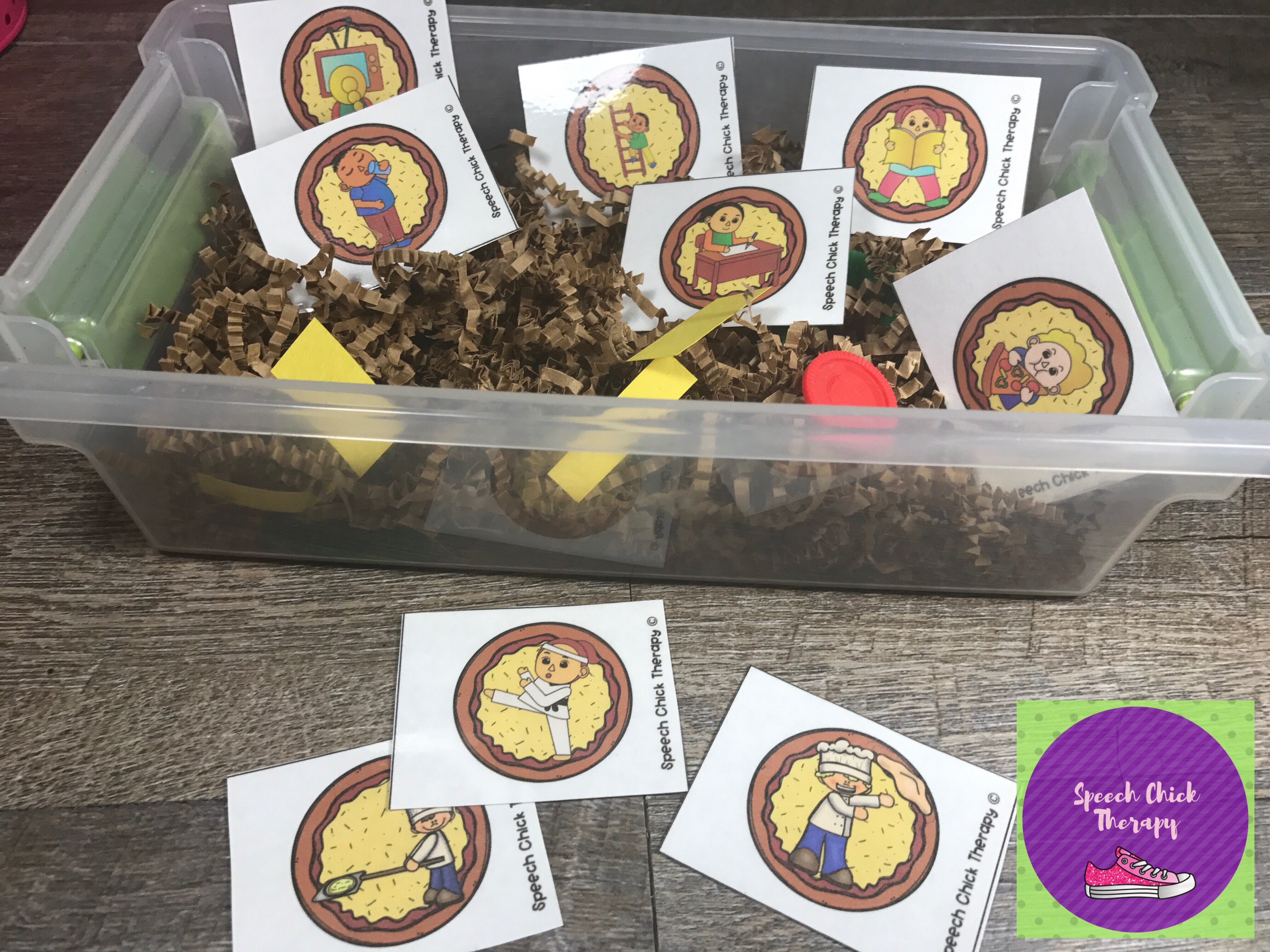 This little sensory bin was quite the hit this week in speech therapy. The kids loved being able to dig around in there even though there was no rice or beans like some of our other bins. If you have plastic/wooden pizza kits, that would be a fun addition too!