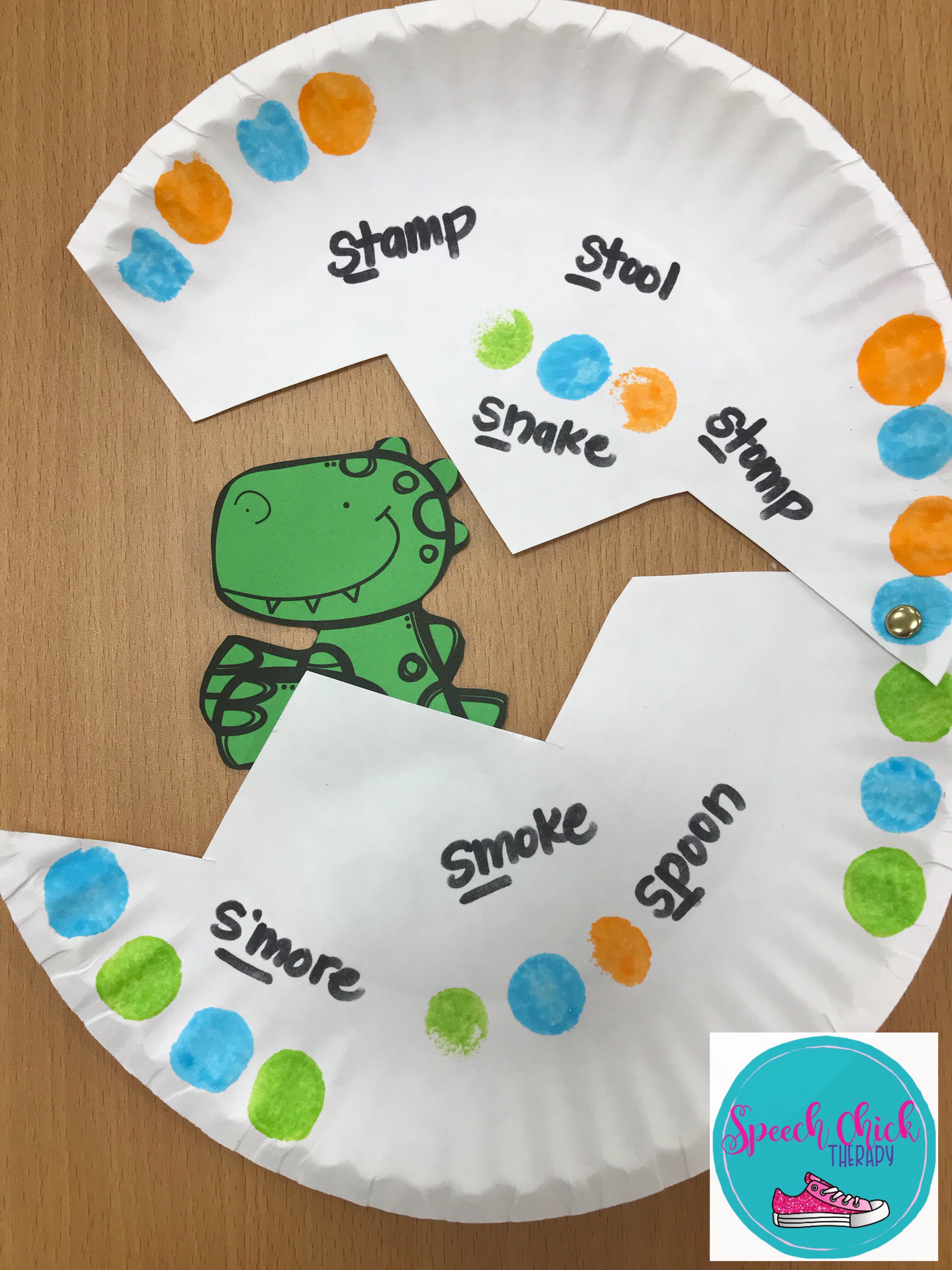I kept this one super easy! I wrote target words on the eggs. If you work with older kids, they could write their own target words. As the child produced their word correctly, he could choose a dot paint and put one dot on their egg ANYWHERE! I am kind of digging these “freedom” crafts. With each trial, he either produced the word 5x correctly or produced a sentence 3x correctly. We circled through the words several times until we had filled up the egg with paint dots. I placed a small hole on the side of both plates and hinged together with a brad. Then we cut out the dinosaur and glued him to the back of the bottom plate. I only used the top half of the dinosaur because he was a little too long.