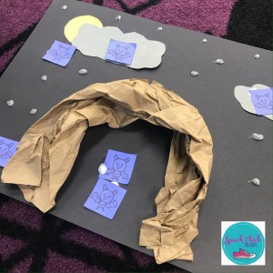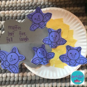 This one is really easy and requires very little materials. I used a large paper plate for the moon. To get more reps per word/sound, I used torn pieces of yellow construction paper. You could paint or color the plate, but you won’t get as many repetitions. We placed a gray cloud partially covering the moon. The kids referred to it as the Halloween moon. The cloud gave us the perfect spot to write target words. Then we glued the bats randomly on the moon and clouds. I printed the bats on colored paper but you could just print on white paper for the kids to color.