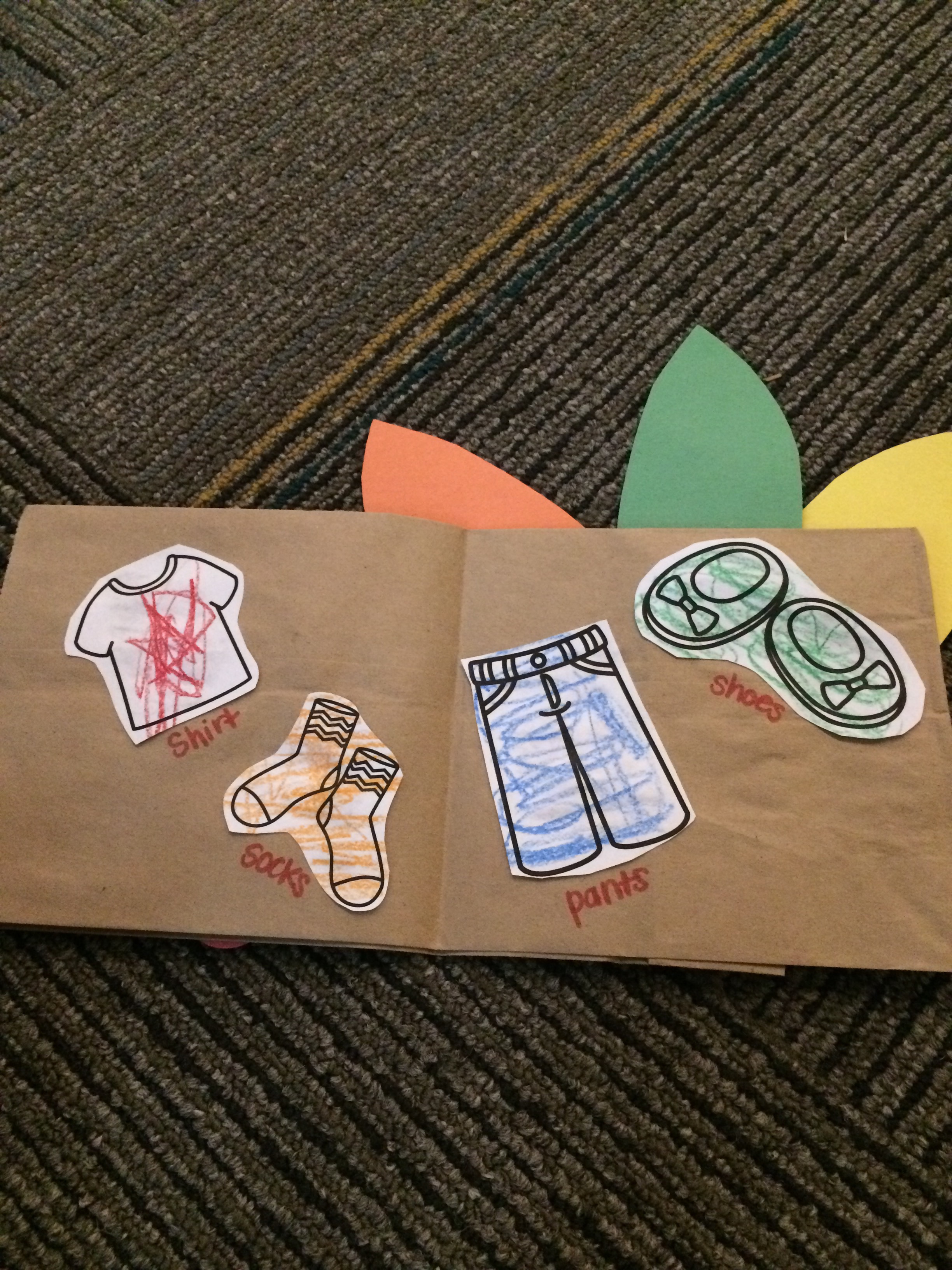 Craft: This year I changed up the craft a little in order to better fit my clients’ goals. We made them into little books! You should have seen my little friends’ faces when they finished their books! The front looked the same for each client. Inside the book was different depending on the client’s goals. This little guy was working on naming clothing pieces. The 3rd picture is the inside of a book that addressed spatial concepts.