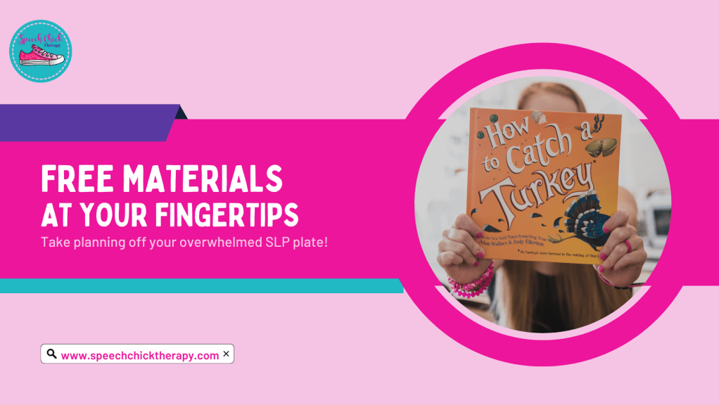 Books: I love (like super big puffy heart) “10 Fat Turkeys!” It’s perfect to address initial /f/ and /g/. My fronting clients LOVE getting to say “GOBBLE GOBBLE” on each page. My kids working on /f/ can practice words like “fat,” “fence”, “fooling,” and “fall.” I am not sure what it is about this book, but the kids laugh so hard throughout the entire story. As we read the story, we took a turkey off the fence on the visual I made. You find it for FREE here! I also added a new book for some of my older kids. “10 Fat Turkeys” doesn’t really have a story good for comprehension skills. That’s why “Turkey Trouble” was added to the lesson plans. I found a great activity packet from TpT (the link is coming up later in the post) to help address my older clients’ goals. If you are wanting a little adventure, you can read “How to Catch A Turkey” ( I have a free book companion in my free resource library!)