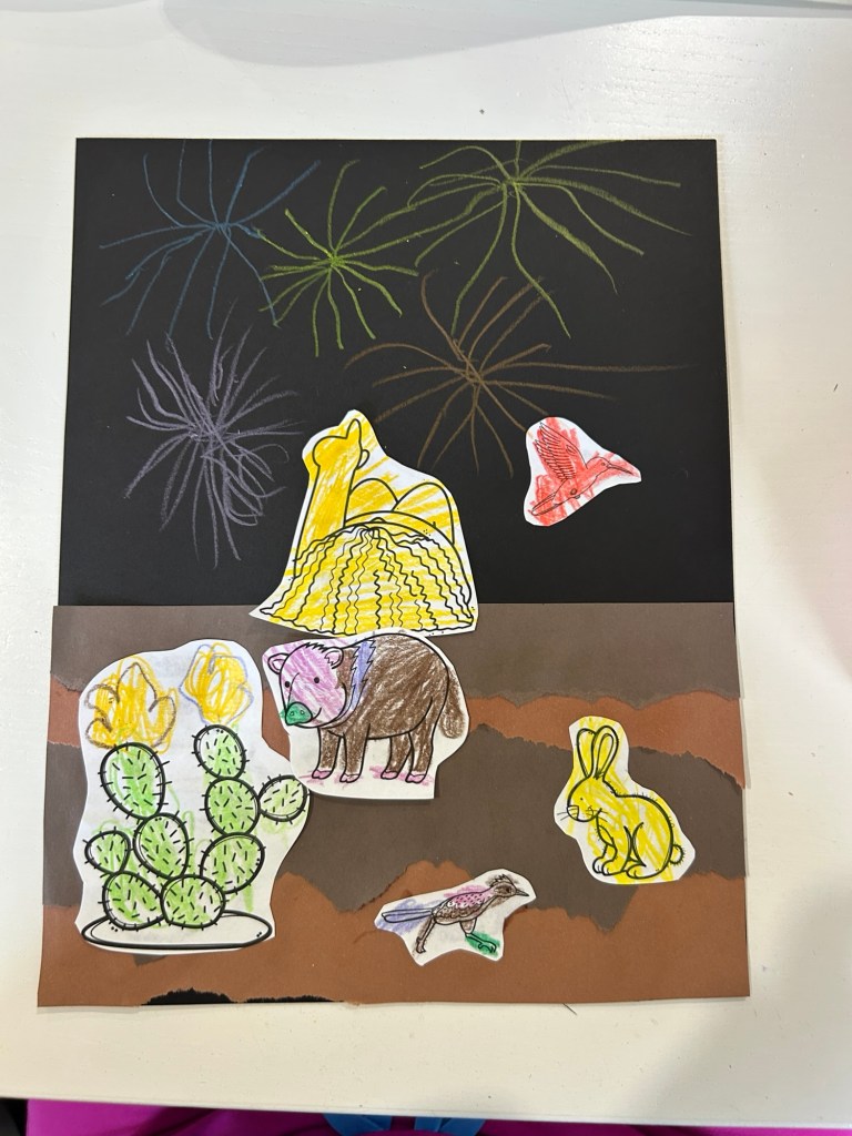 To set up our “day,” I shared from our National Parks book as well as this YouTube video (very short one). I like to use this video because it really drives home how clear the sky is at night. Then I tell the student(s) we are going to be to watching fireworks (or stargazing) today. Each student needs a black sheet of construction paper and 2 strips of ripped brown construction paper as well as pictures of animals found in Big Bend. (side note: my TpT resource will have resources to help create this craft. Keep an eye out for it!) Have the child color the animals and cut them out.